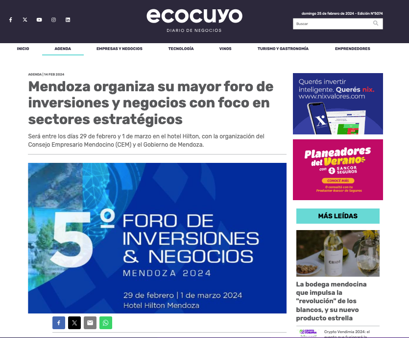 It will be held from February 29 to March 1 at the Hilton Hotel, organized by the Mendoza Business Council (CEM) and the Government of Mendoza.