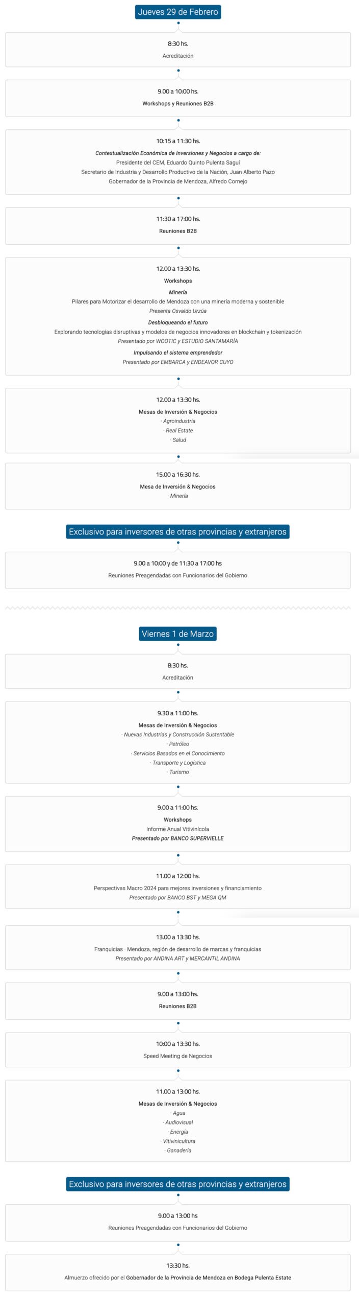 Durante las dos jornadas habrá reuniones preagendadas con funcionarios del Gobierno, reuniones entre privados, conferencias, paneles de disertación a cargo de destacados funcionarios y empresarios, mesas de inversión y negocios sectoriales, rondas de negocios entre inversores y emprendedores, y networking empresarial.
